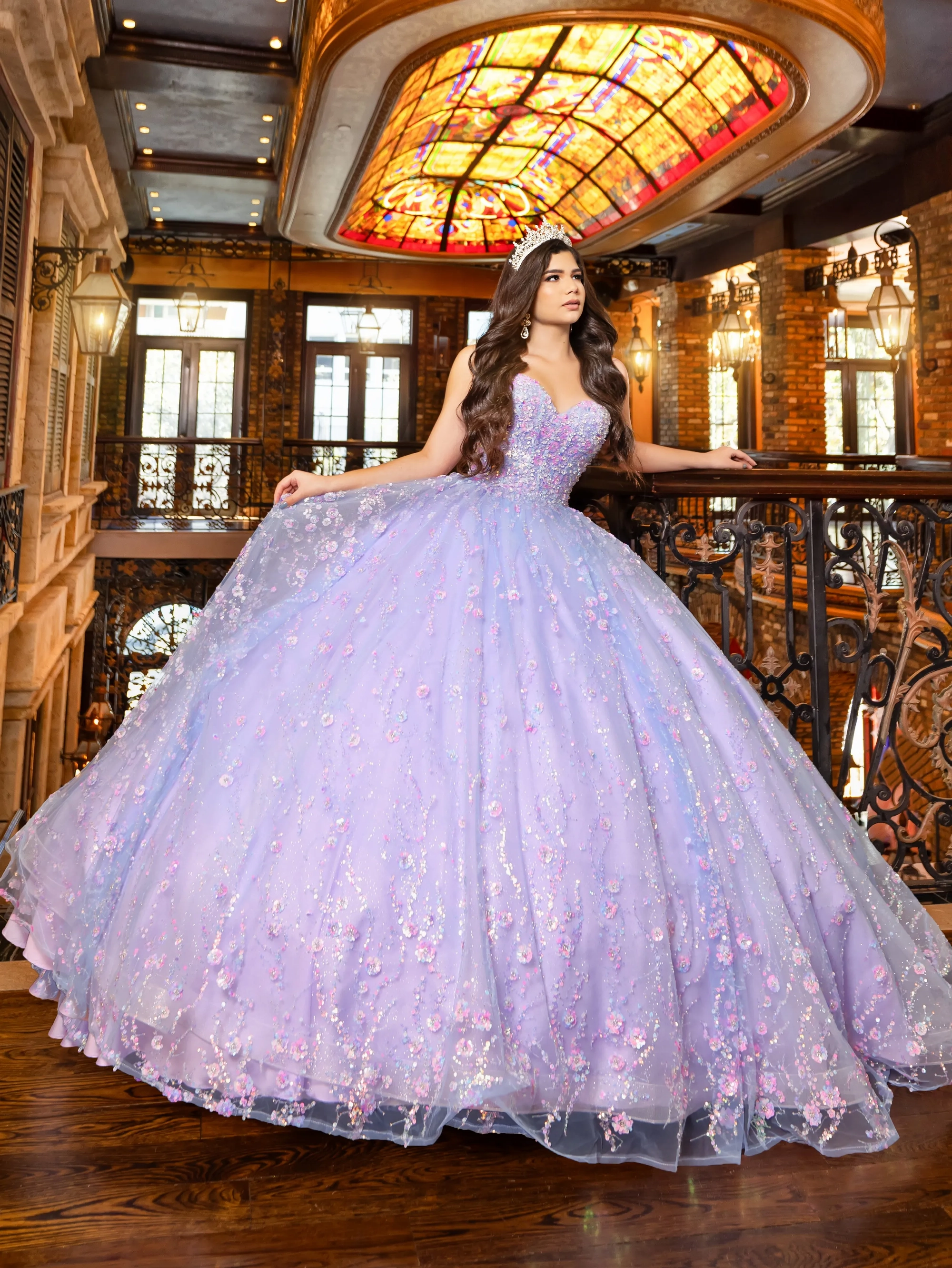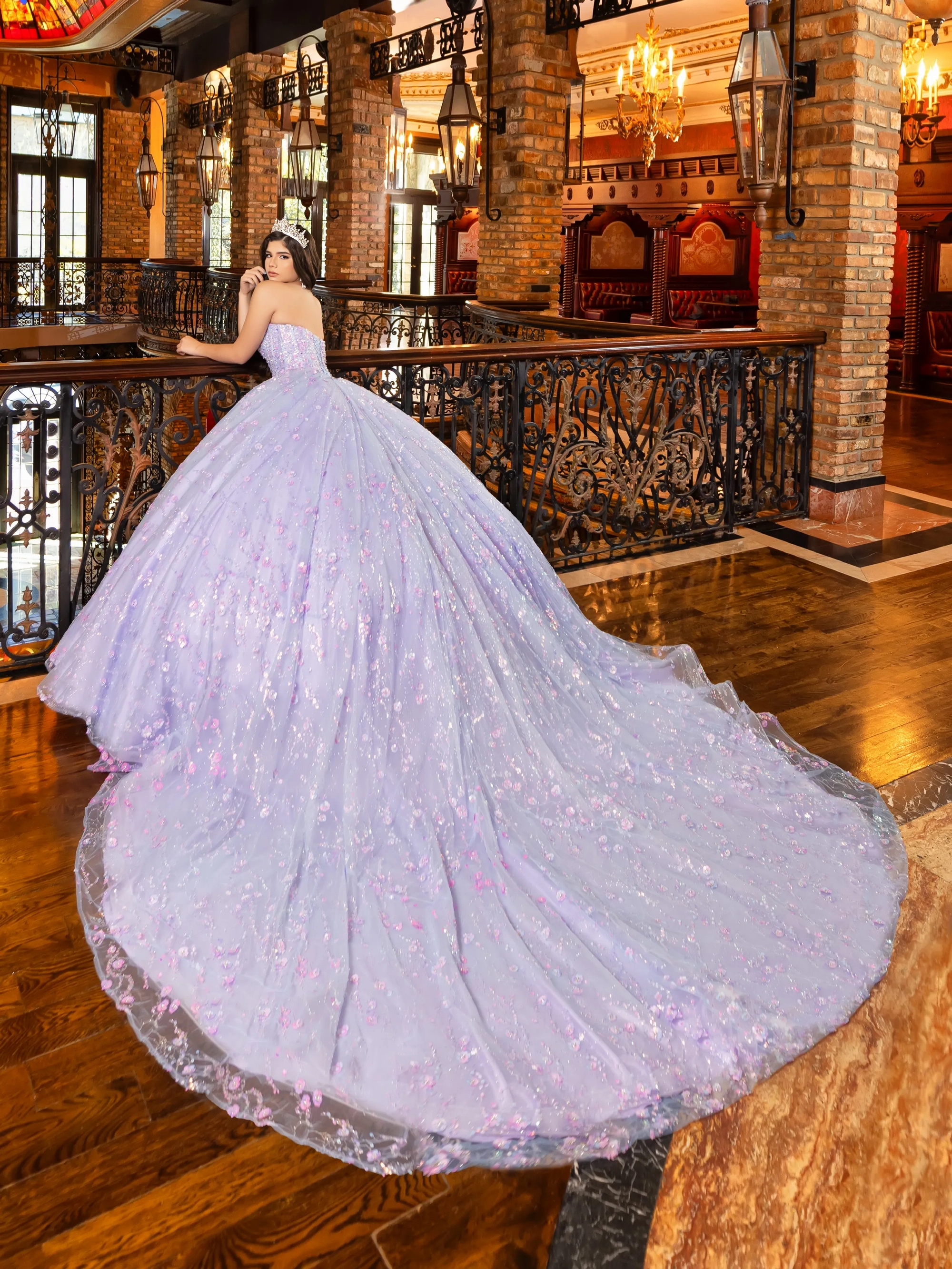 This Quinceanera dress is a fairytale-inspired gown that would be perfect for a garden-themed event. The sweetheart bodice is adorned with three-dimensional floral appliqués in pastel colors that flow down the glittery tulle skirt. A unique touch is added with a beautiful sheer hooded cape. The gown is completed with a royal train, making it a stunning and regal choice for any Quinceanera.