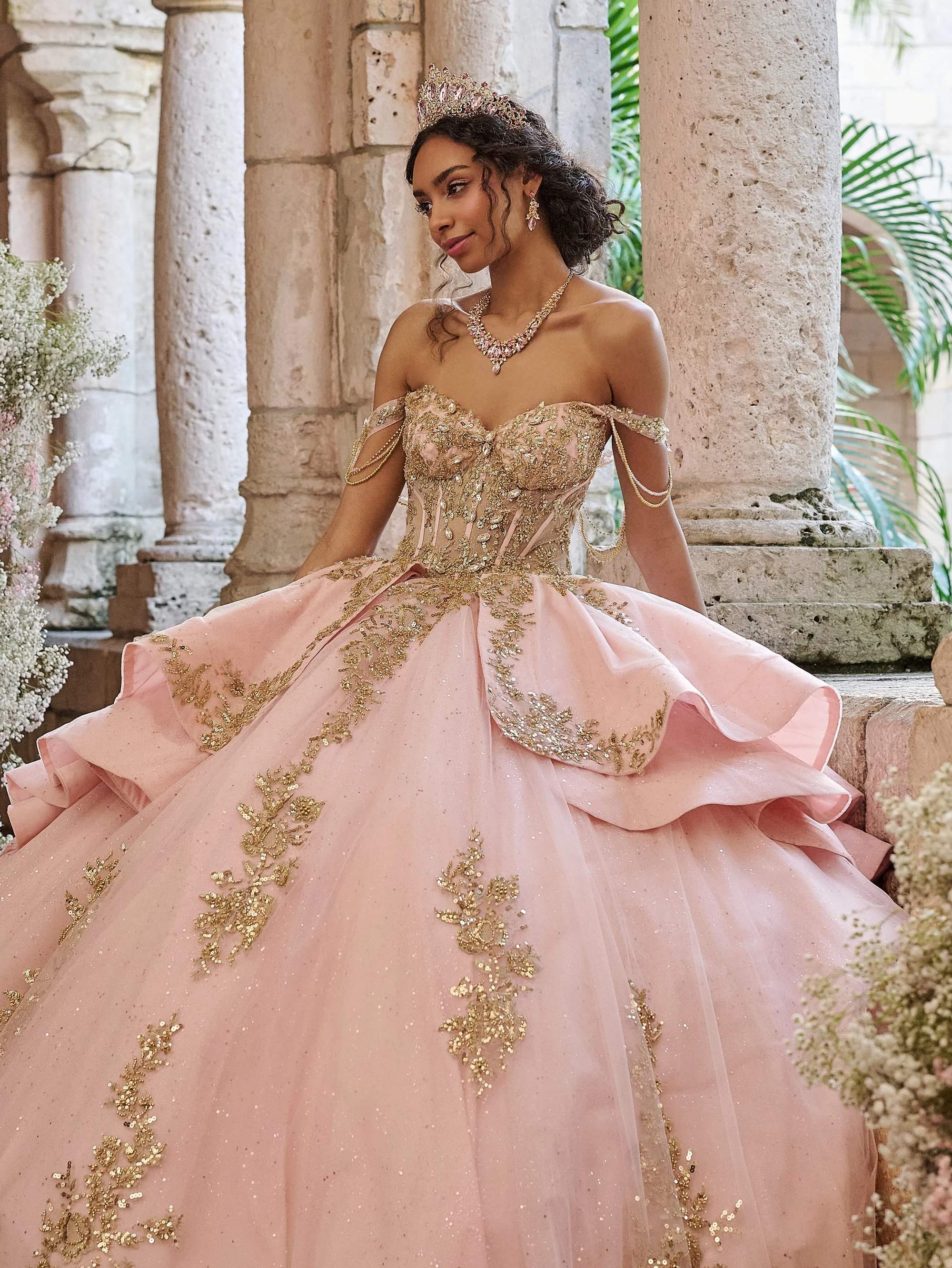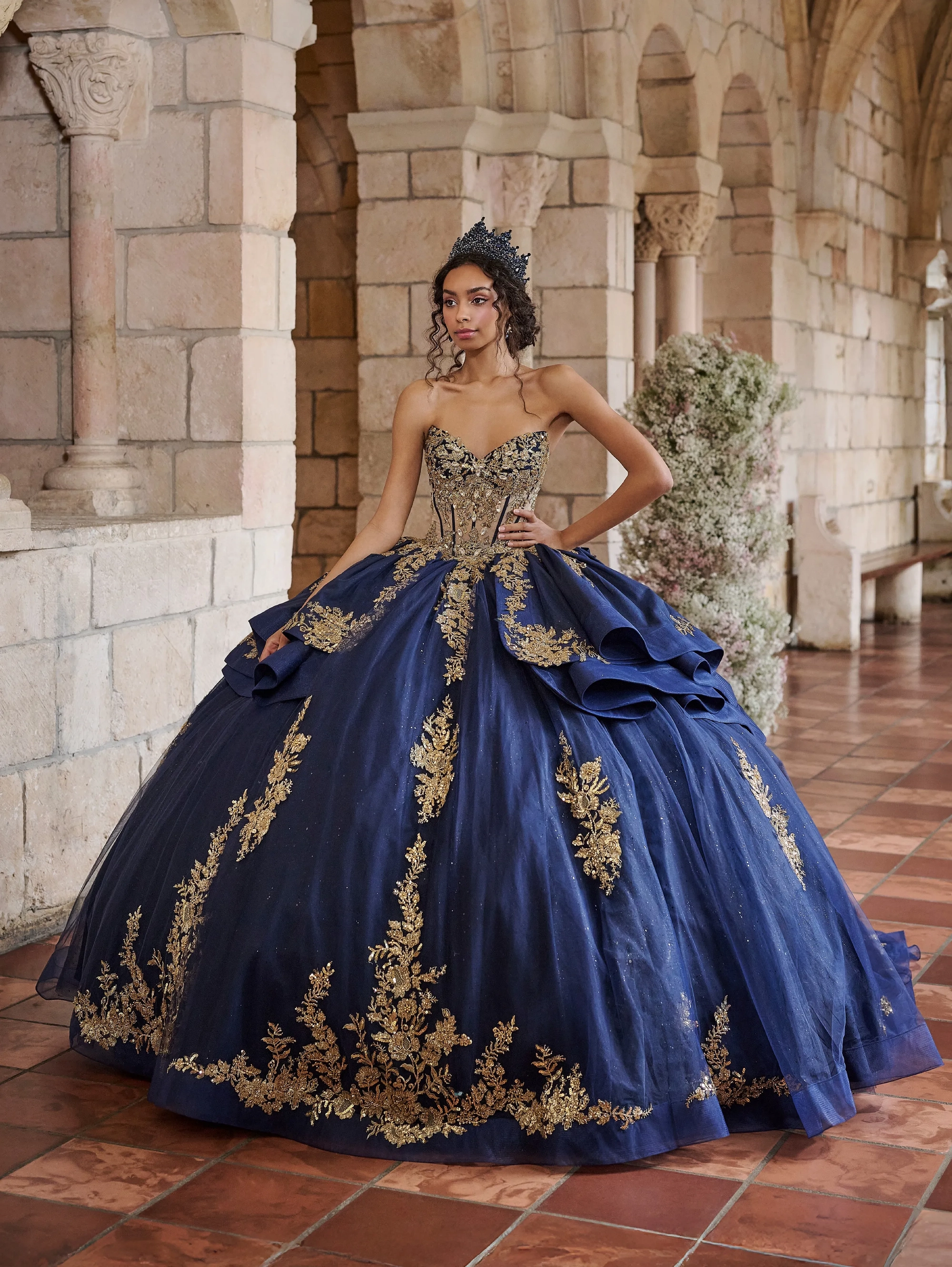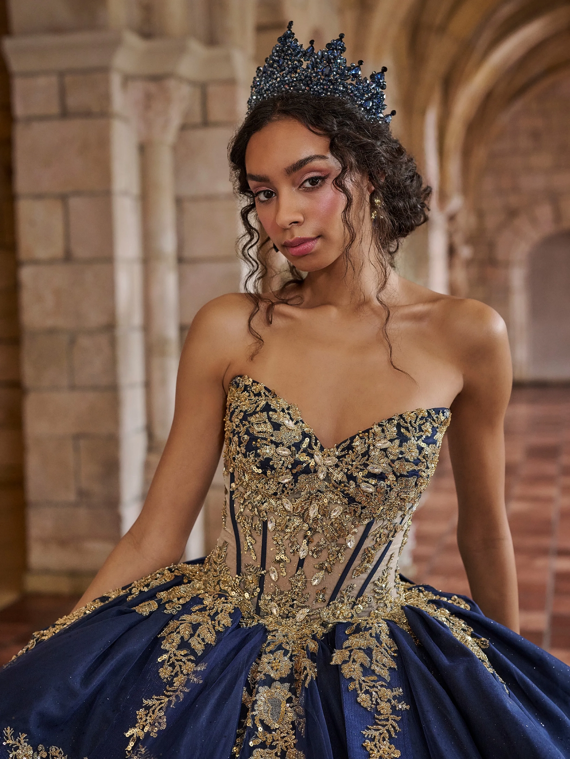 Exude regal elegance in this breathtaking ball gown, featuring a structured corset bodice with intricate gold embroidery and shimmering embellishments. The voluminous skirt is adorned with cascading appliqués and dramatic overskirt details, while delicate draped removable beaded straps add an ethereal finishing touch. Tulle/Glitter Tulle