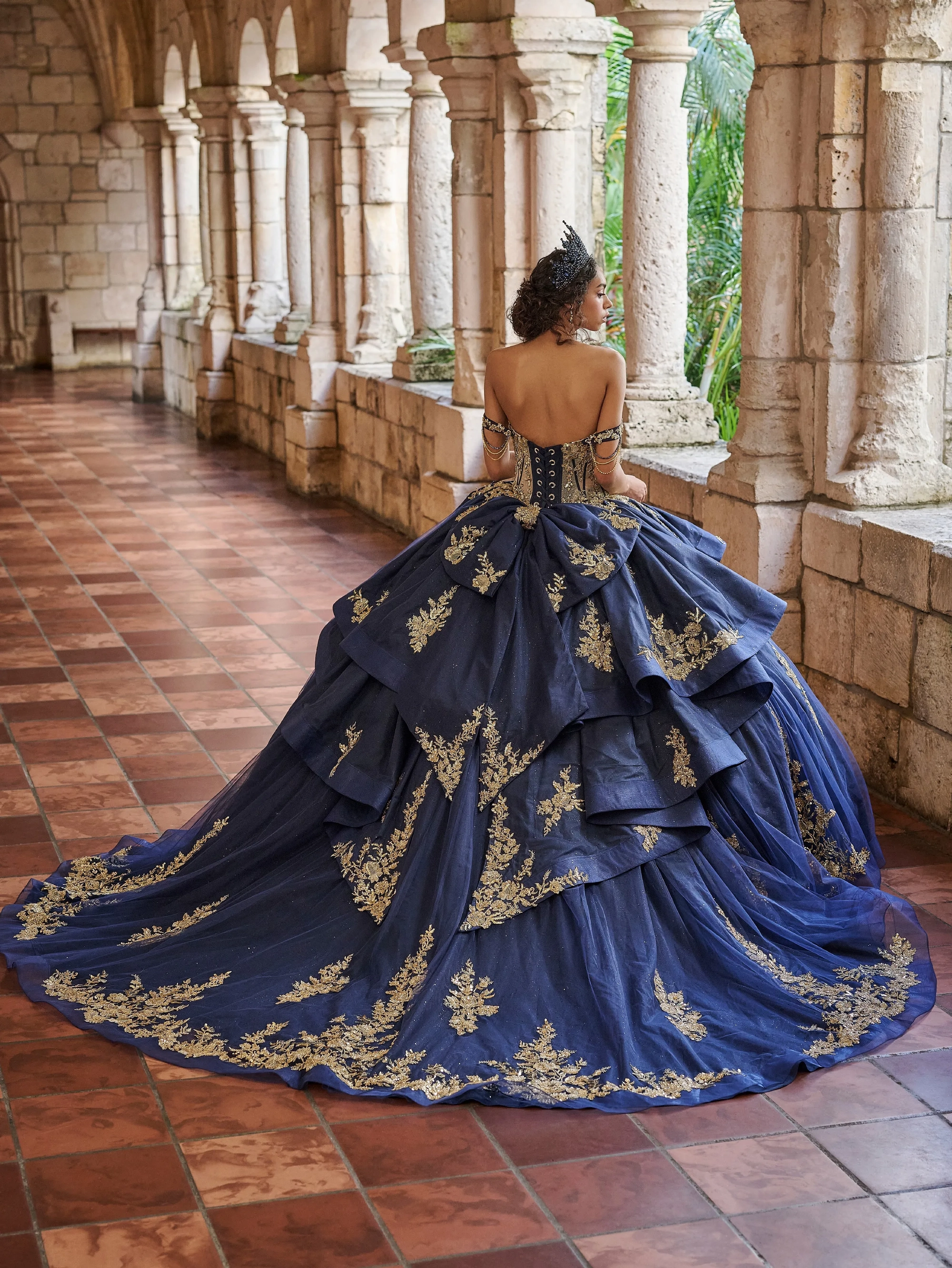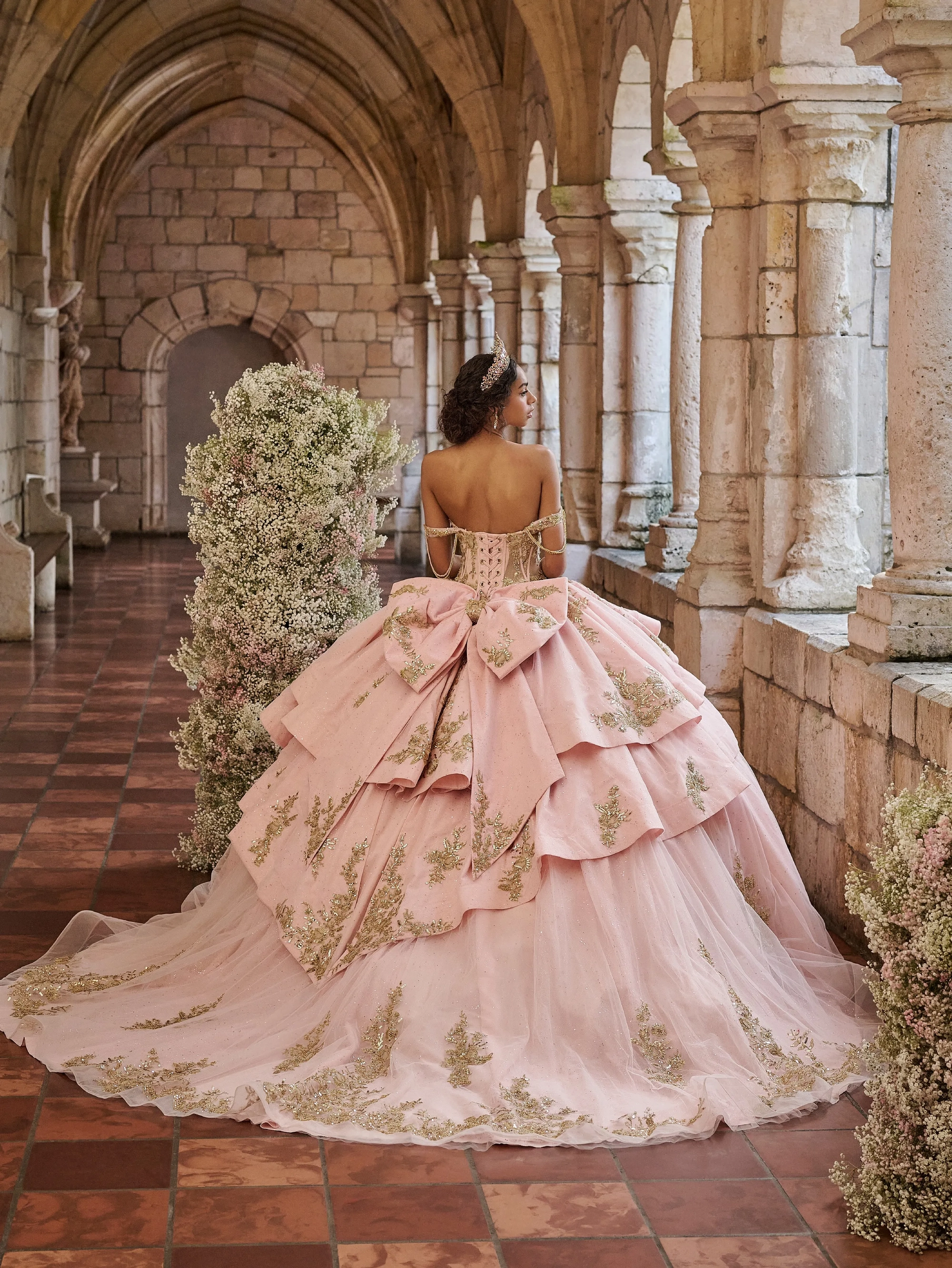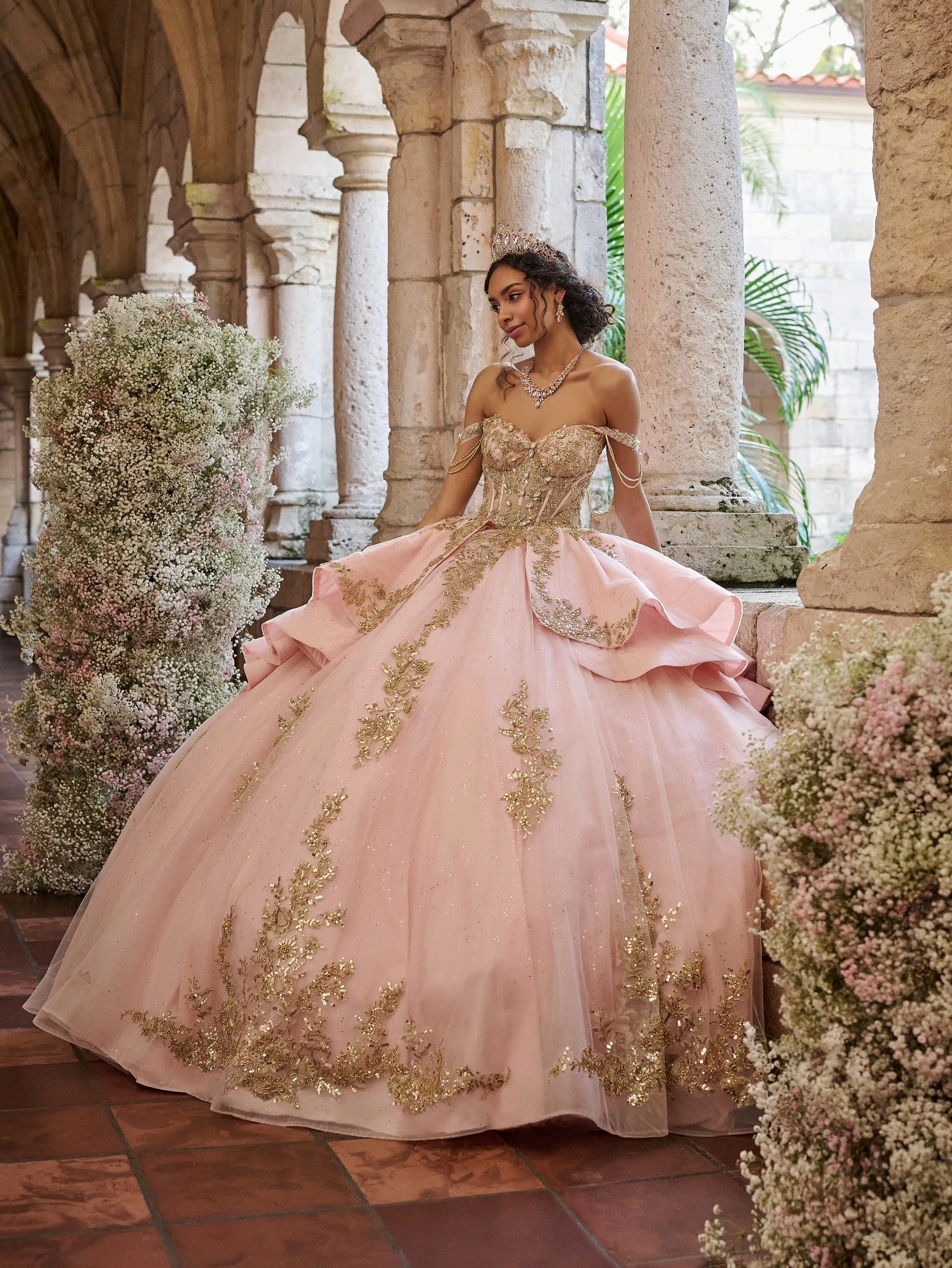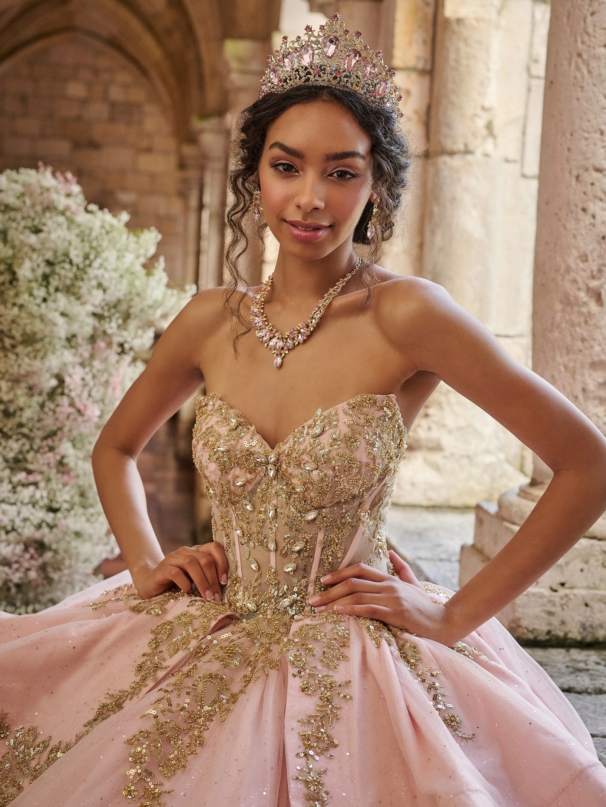 Exude regal elegance in this breathtaking ball gown, featuring a structured corset bodice with intricate gold embroidery and shimmering embellishments. The voluminous skirt is adorned with cascading appliqués and dramatic overskirt details, while delicate draped removable beaded straps add an ethereal finishing touch. Tulle/Glitter Tulle